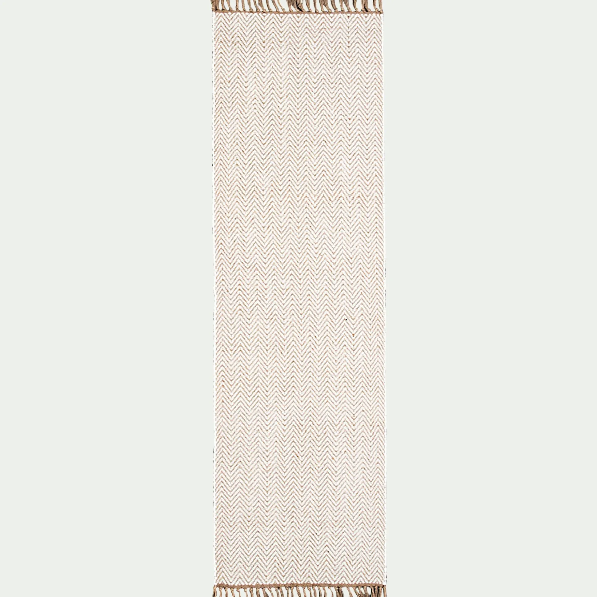 Le couloir est une pièce à part entière de la maison. Habillez-le et décorez-le avec charme, en le mettant en valeur avec un tapis. Optez pour ce tapis de couloir aux couleurs et motifs doux. Le tapis Turau est inspiré de l’Inde et de sa culture. En Inde, le tapis est un objet précieux que l’on retrouve dans les palais, au sol ou encore au mur. Celui-ci est tissé principalement en laine associé avec de la jute. Ce mélange des matériaux naturels confère à ce tapis blanc un côté authentique et ethnique. De légers détails viennent donner une touche d’élégance à ce tapis aux franges nouées à la main.