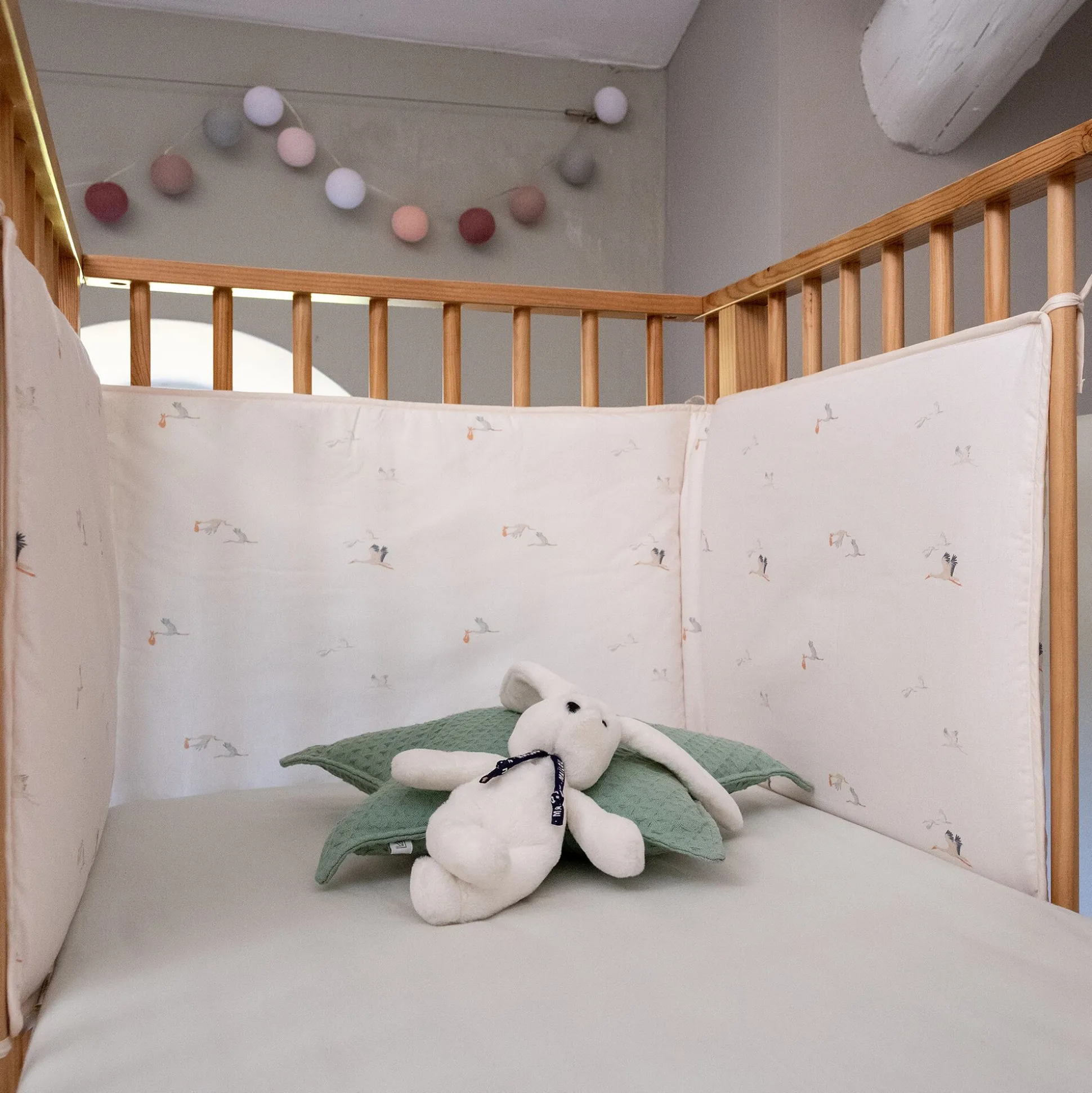 Ce tour de lit, conçu pour un lit bébé à barreaux de 60×120 cm, allie sécurité et douceur. En coton bio, il offre un contact naturel et respectueux de la peau délicate de bébé. Son motif de cigognes en plein envol, imprimé sur un fond blanc apaisant, crée une ambiance sereine propice au repos. Placé autour des barreaux, le tour de lit protège bébé des chocs et évite les courants d’air, tout en apportant une touche décorative harmonieuse à la chambre.