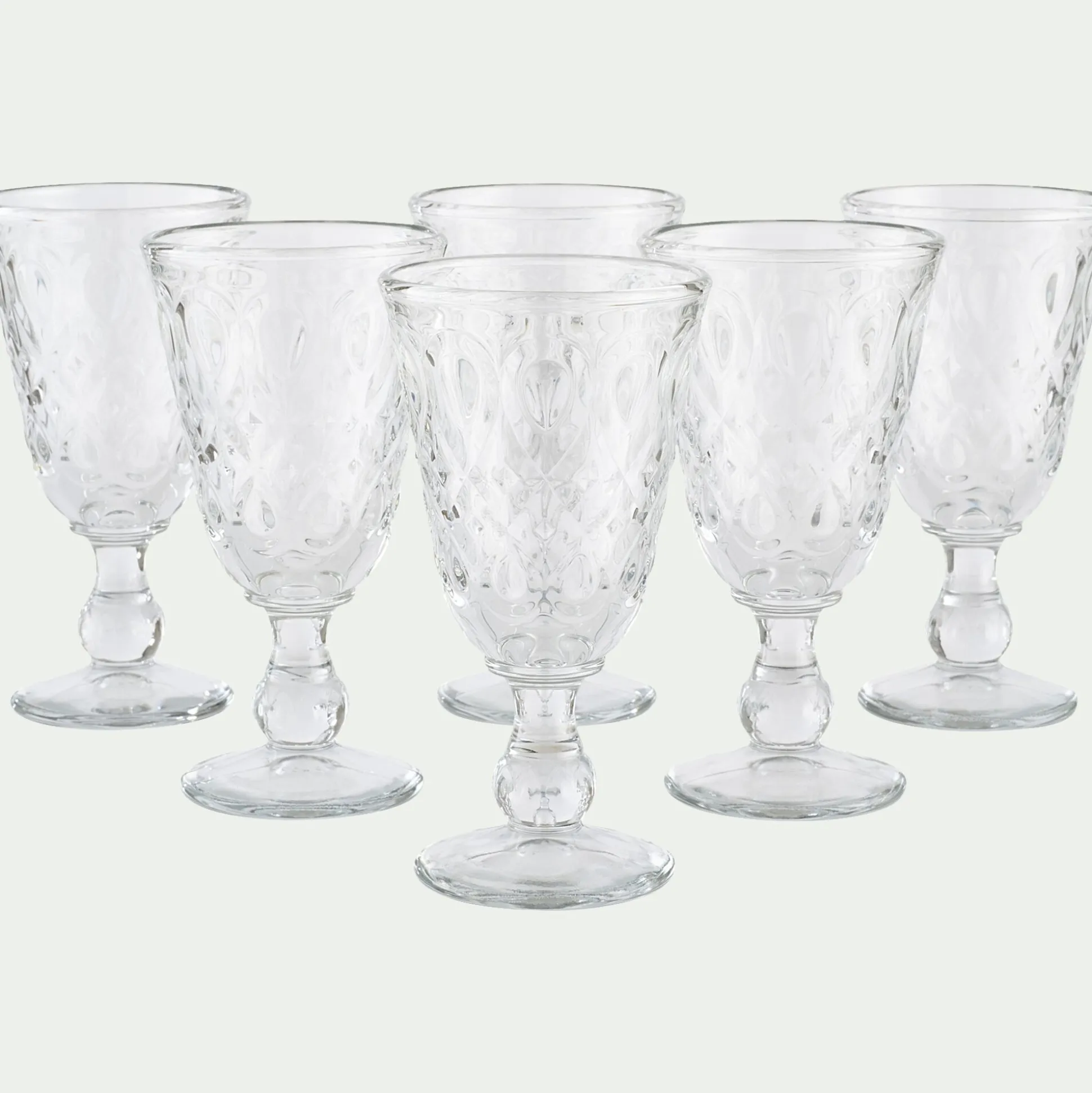 Ajoutez une touche d’élégance à votre table en optant pour ces verres à vin raffinés. Leur design brut et authentique, agrémenté d’un motif en relief, confère une esthétique unique à ces verres transparents. Ce lot de 6 verres de table ajoute subtilement une note chic à la déco de votre table. Avec une contenance de 23 cl, ces verres à pied en verre vous accompagnent tout au long du repas, ajoutant une dimension sophistiquée au dressage de votre table.