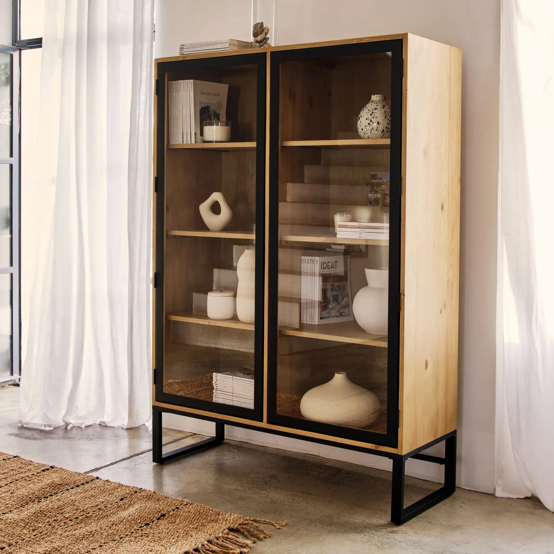 Exposez votre décoration avec la vitrine Endoume. Ce grand meuble se compose de deux portes battantes vitrées qui laissent admirer l’intérieur de la vitrine. Six tablettes s’offrent à vous pour composer votre décoration. Livres, vases, plantes, bougies, statues, photographies… Vos trouvailles et trésors trouvent parfaitement leur place dans cette vitrine en pin massif. Le bois s’associe à des détails en métal noir afin de mêler authenticité et modernité. Une alliance tendance qui a tout bon.